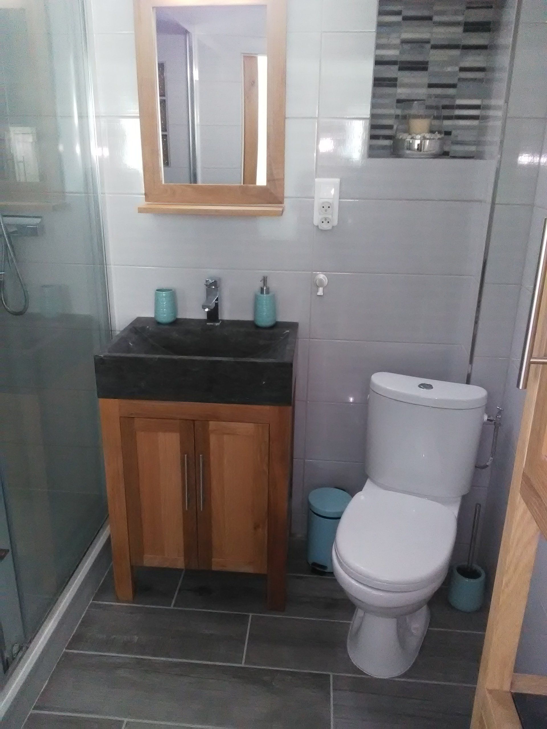 It has a private sanitary space, equipped with a spacious shower (75x180), a toilet, storage and a hair dryer.